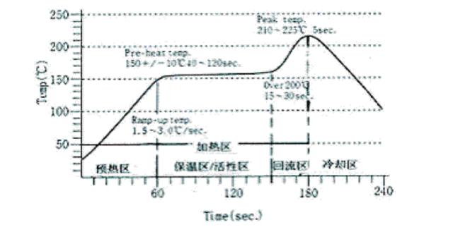 圖 1 是中溫錫膏( Sn63 / Sn62 )理想的紅外回流溫度曲線,它反映了 SMA 通過回流爐時(shí), PCB 上某一點(diǎn)的溫度隨時(shí)間變化的曲線,它能直觀反映出該點(diǎn)在整個焊接過程中的溫度變化,為獲得最佳焊接效果提供了科學(xué)的依據(jù),從事 SMT焊接的工程技術(shù)人員,應(yīng)對理想的溫度曲線有一個基本的認(rèn)識,該曲線由四個區(qū)間組成,即預(yù)熱區(qū)、保溫區(qū)/活性區(qū)、回流區(qū)、冷卻區(qū),前三個階段為加熱區(qū),最后一階段為冷卻區(qū),大部分焊錫膏都能用這四個溫區(qū)成功實(shí)現(xiàn)回流焊。故紅外回流爐均設(shè)有 4 - 5 個溫度,以適應(yīng)焊接的需要。