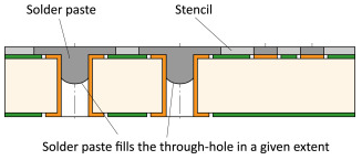 通孔插裝元件需要具備一定耐高溫能力才能完成回流。目前主流的回流錫膏有低溫的SnBiAg系列(熔點139℃左右)和中溫的SnAgCu系列(熔點217℃左右)。可針對一些合適的通孔元件采用回流工藝。通孔回流和常規(guī)回流步驟相似。但通孔回流無鉛錫膏需要被印刷到鍍通孔內(nèi)部,這一過程受印刷速度,印刷角度和鍍通孔直徑的影響。印刷質(zhì)量會很大程度影響焊點強度,因此這些參數(shù)需要根據(jù)實際情況進行精確設(shè)計。