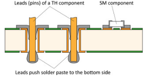 在把錫膏順利印刷到鍍通孔后,自動放置機會拾取通孔插裝元件插入通孔中。通孔元件的引腳撕裂鍍通孔中的錫膏,并將一部分錫膏膏推到底部。底部的錫膏在回流熔融時會通過毛細作用流回鍍通孔中,從而完全填充鍍通孔內(nèi)部。