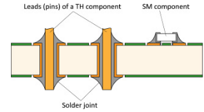 通孔插裝焊接是一種比較老的電子元件裝配技術(shù)。首先需要在PCB上打通特定尺寸的鍍通孔,然后印刷或涂覆錫膏至焊盤,再將通孔插裝元件的引腳插入到這些通孔內(nèi),帶入少量錫膏在孔內(nèi),通過回流焊固化錫膏來實現(xiàn)裝配目的。顯然通孔的尺寸要略大于元件引腳才能對其進行容納。通孔插裝技術(shù)現(xiàn)在使用的相對較少,這是由于插裝元件體積較大,很難用作高密度和細間距封裝。