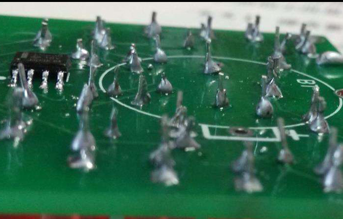 在波峰焊接時(shí),從拉尖的形狀大致可以知道鉛料槽的溫度及夾送速度是否合適。當(dāng)拉尖有金屬光澤且呈細(xì)尖狀時(shí),不是鉛料槽的溫度低就是夾送速度過(guò)快;而當(dāng)。拉尖呈圓、短、粗而無(wú)光澤狀態(tài)時(shí),原因正好與上完全相反