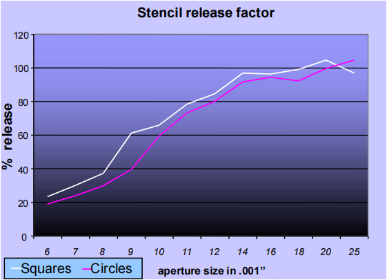 測試數(shù)據(jù)表明,對于小孔徑,方形孔表現(xiàn)要比圓形孔要好,如下圖所示(結果來自于一個0.005”的電鑄鋼網(wǎng))