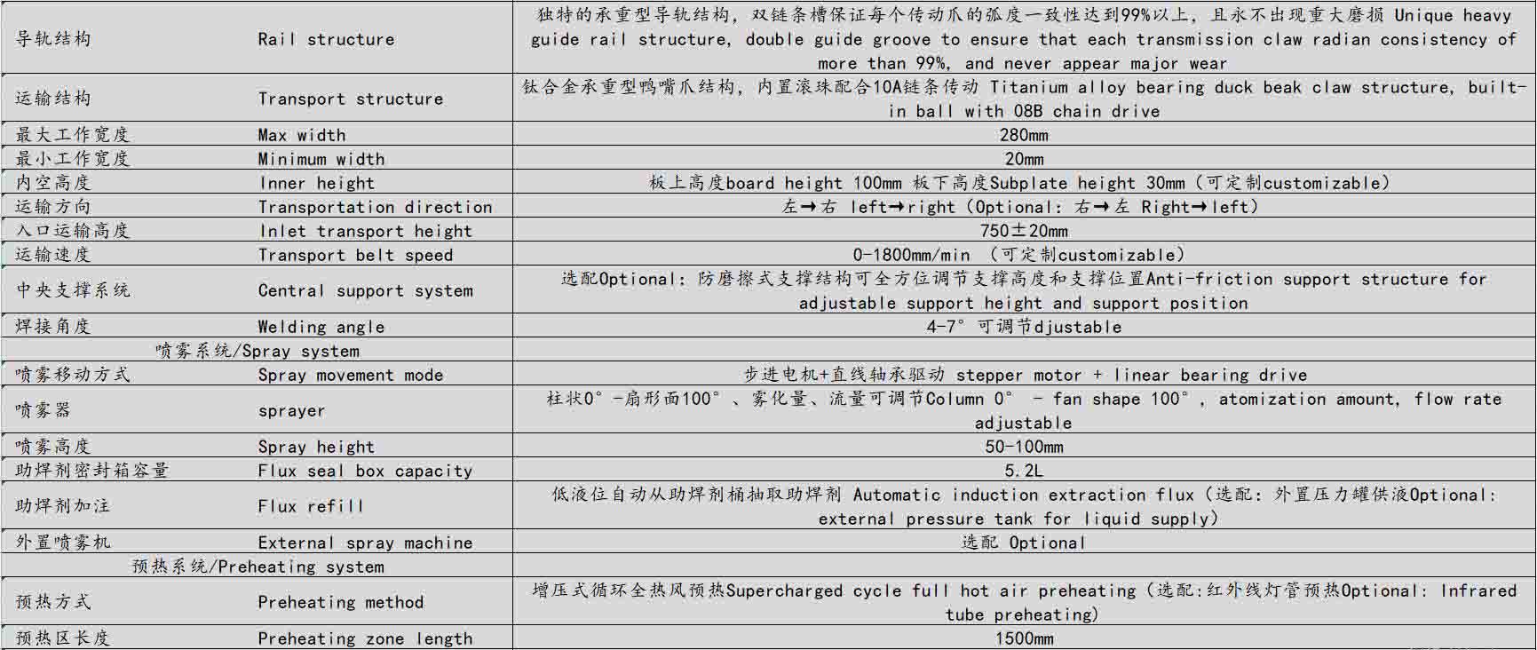 ● 獨特的承重型導軌結(jié)構(gòu),滾珠鏈條配合上下雙導槽保證每個傳動爪的弧度一致性達到99%以上,可滿足高要求、重型產(chǎn)品、治具的過爐要求,運輸時元器件無抖動,可承重100KG不變形不磨損