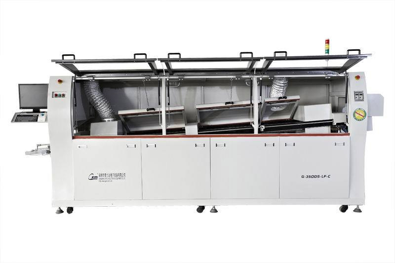 中型波峰焊,型號:G-350DS-LF大型全電腦控制波峰焊各一臺以及自動插件線5段,進板接駁1臺,出板接駁一臺,后焊線9米。